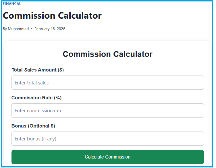 Commission Calculator is a simple online tool designed to help you quickly calculate the commission amount you earn from sales whether you’re a salesperson, freelancer, agent, or business owner. This calculator removes manual math and gives immediate, accurate results based on your inputs.
