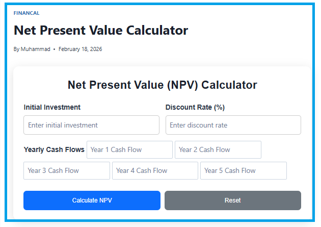 Net Present Value Calculator is an essential finance tool that helps you assess the real value of future cash flows by accounting for the time value of money. Whether you’re evaluating business projects, investment opportunities, or real estate, this calculator provides fast, reliable insights to guide better financial decisions.